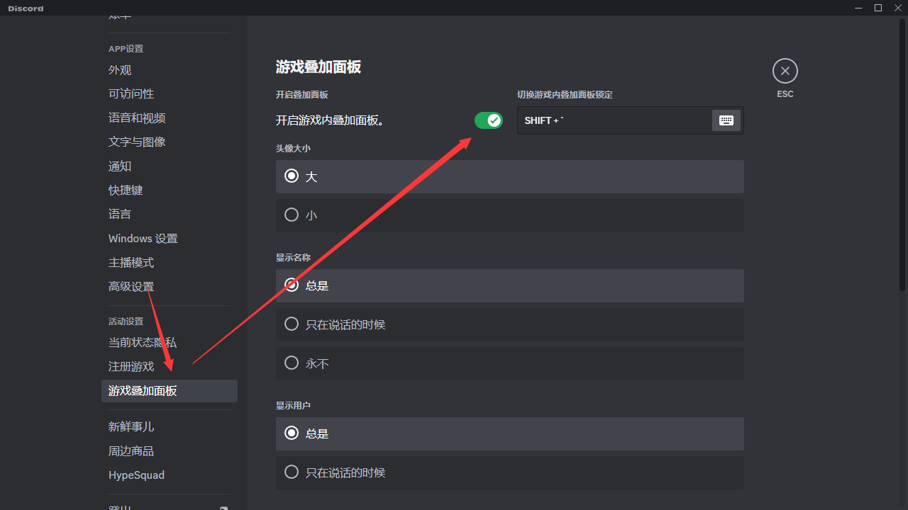 **进入Discord设置->游戏叠加->启用游戏内叠加（玩游戏时必须运行Discord）**